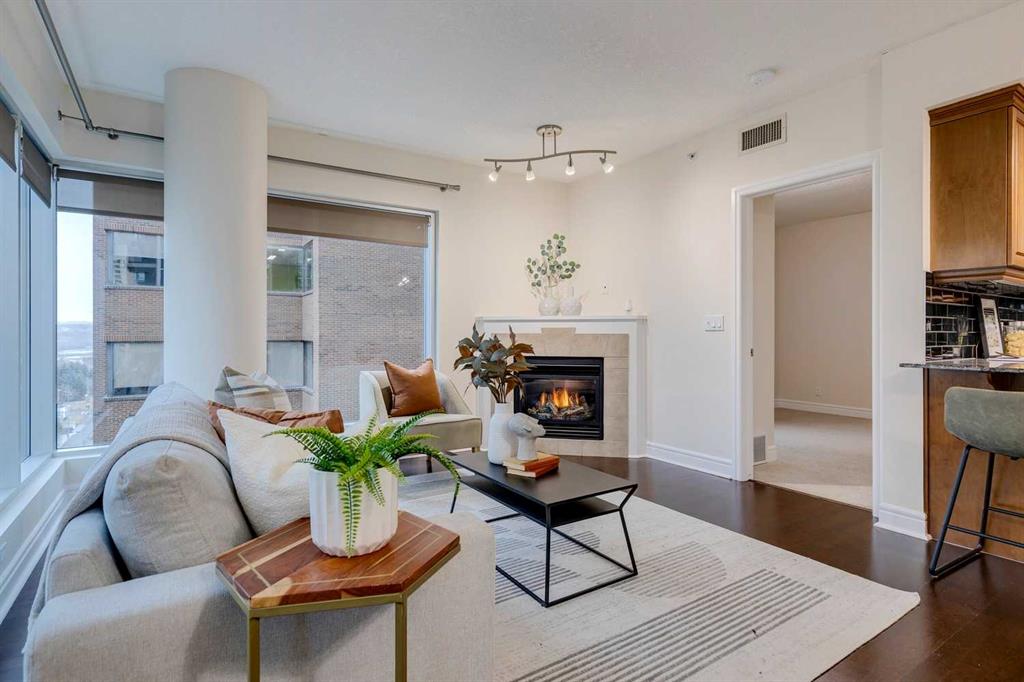 Bright + stylish corner unit in popular building + with expansive urban views; this 2 bedroom 2 bathroom unit has recently been freshly painted + move in ready. The layout offers comfort, style + convenience. Gleaming hardwood flooring + an abundance of natural light throughout. The spacious living area is highlighted by a cozy corner fireplace and large windows that showcase urban views and westerly sun—creating a warm, inviting atmosphere all day long. The spacious kitchen provides ample counter + cabinet space + seamlessly connects to the dining and living areas, making it ideal for both everyday living and entertaining. The well-designed floor plan ensures privacy, with well-separated bedrooms including a primary suite with a walk-in closet and private 3-piece en-suite, and a second bedroom with its own discrete ensuite access—perfect for guests, roommates, or a home office. In suite laundry room with extra storage, underground parking + secure storage unit, bicycle storage, car wash, party room + roof top deck as well as a very friendly concierge service in the welcoming lobby. This pet friendly building is steps from an off leash park, close to the river + trendy restaurants, cafes + shopping. Flexible possession + very easy to show. A wonderful walkable property in excellent location.